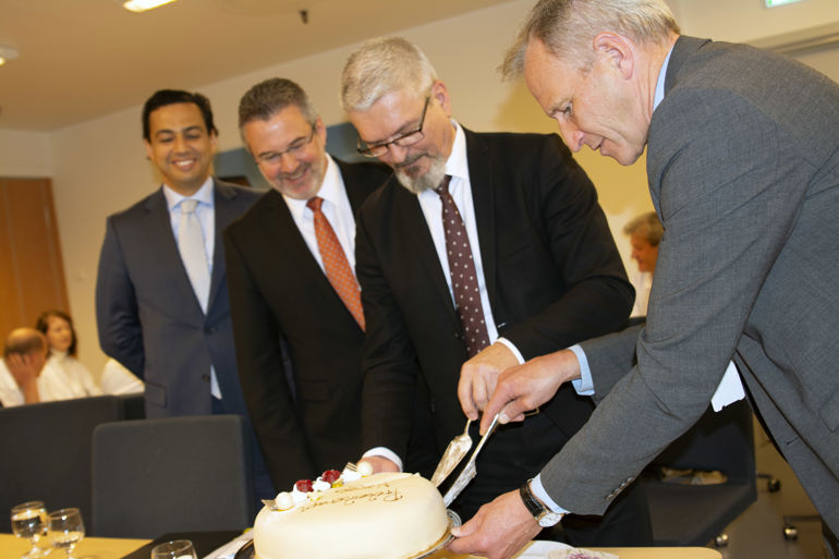 Administrerande direktør i Helse Bergen Eivind Hansen gjev teamet frå Varian Medical Systems ei hjelpande hand ved kakefeiringa under kontraktsigneringa.